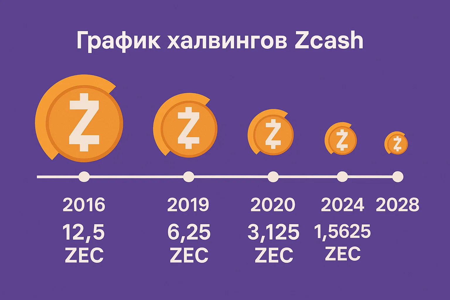 Халвинг Zcash происходит примерно каждые 4 года. График халвингов: