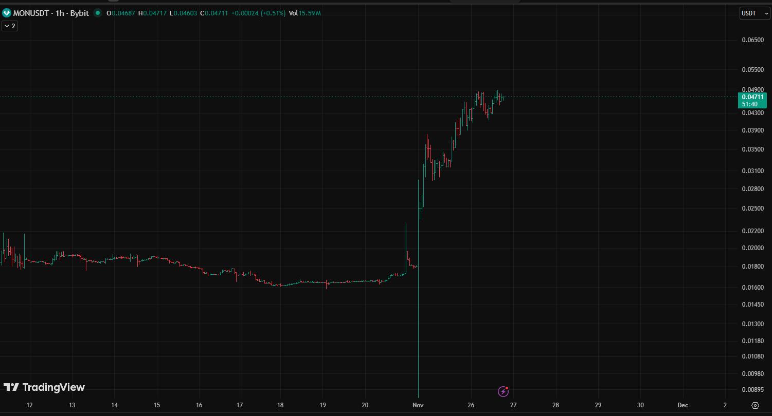 Токен MON совершил дебют 24 ноября с начальной котировкой $0.025, что соответствовало цене ICO на платформе Coinbase. Однако на первых минутах торгов котировки упали, инициировав продажи среди получателей аирдропа. Несмотря на этот откат, криптовалюта быстро восстановилась и в течение суток поднялась до $0.044 за токен.